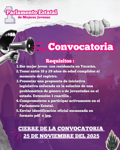 Yucatán presenciará el primer Parlamento Estatal de Mujeres Jóvenes en diciembre de este año, convocan a mujeres entre 18 y 29 años a sumarse para presentar sus ideas y propuestas, en la búsqueda de crear una agenda con perspectiva de género.