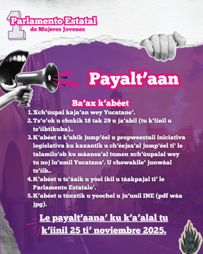 Dayana Conca Parra, del Colectivo Estudiantil Ix Balam, señaló que para el primer parlamento estatal en Yucatán podrán participar mujeres desde los 18 hasta los 29 años. Sensibilizó que este evento responde a una deuda histórica hacia las mujeres y, particularmente, las mujeres jóvenes.
