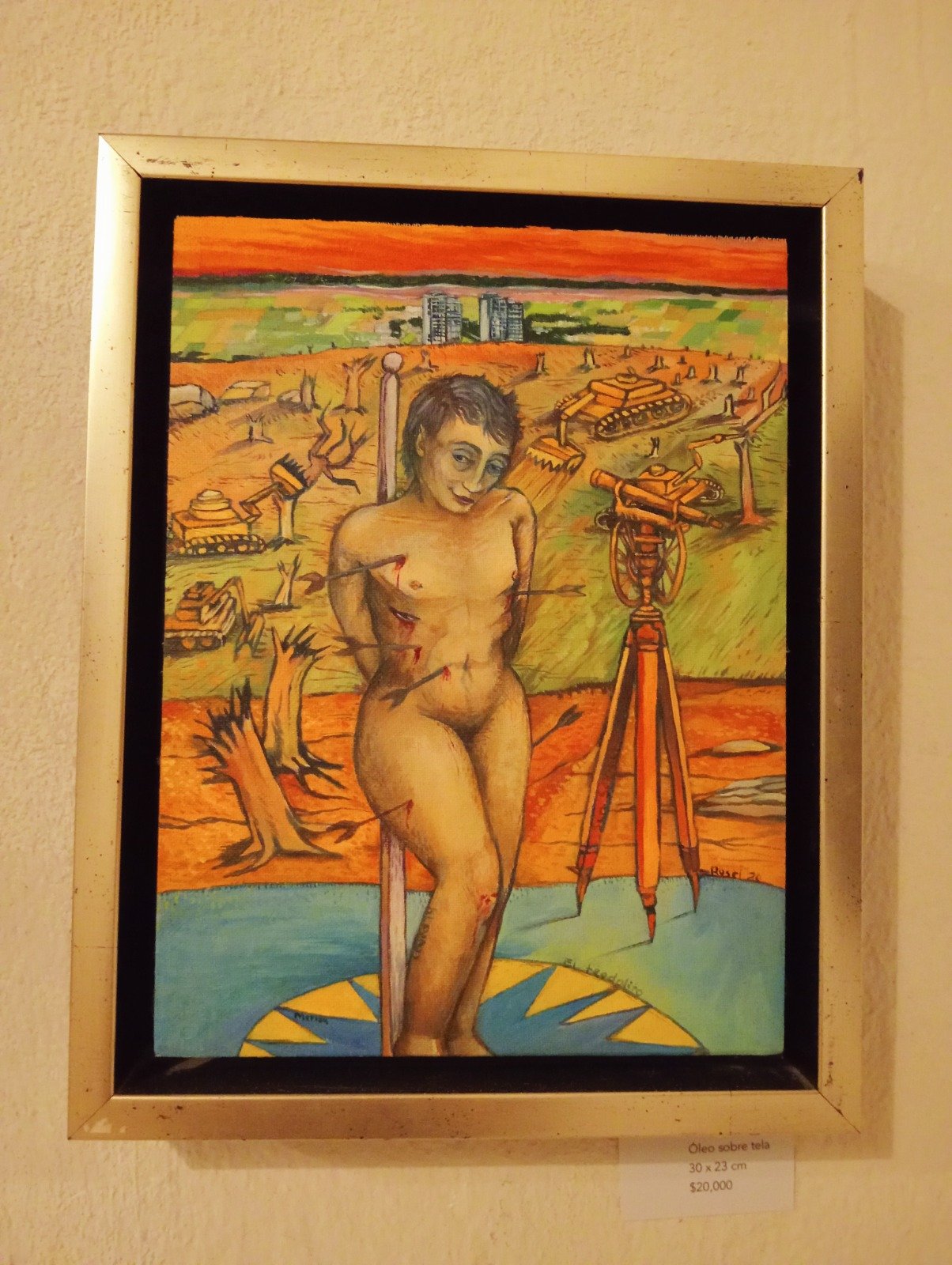 Uno de sus óleos “Quemazón” es el ejemplo perfecto de su visión actual de este pedazo del mundo. Se transpira destrucción en cada pincelada. Pero la vida lucha, se muestra en primer plano, doliente sí, pero existente. Tortugas se abren paso ante la catástrofe, mientras el bufón que divierte o provoca terrores esboza una sonrisa enigmática y perturbadora, nos hacemos preguntas, ¿somos espectadores pasivos de nuestra propia extinción?