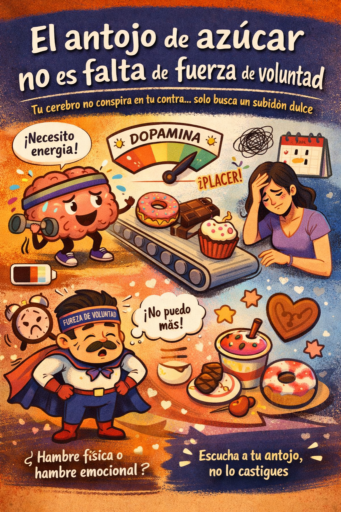 Además, muchos antojos no tienen que ver con hambre física, sino con hambre emocional. El azúcar actúa como un regulador momentáneo del malestar: calma, distrae, reconforta. No resuelve el problema, pero lo anestesia por unos minutos. Por eso aparece con más fuerza en días difíciles, discusiones, jornadas largas o cuando sentimos que no tenemos control sobre otras cosas.