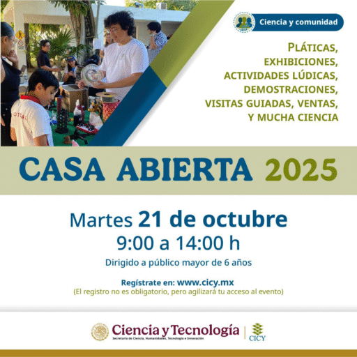 El Centro de Investigación Científica de Yucatán A. C. (CICY), abre nuevamente sus puertas a la sociedad con motivo de su evento anual Casa Abierta, que se celebrará el próximo 21 de octubre de 2025, de 9:00 a 14:00 h, en sus instalaciones en Mérida.