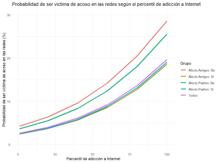 Concretamente, en un estudio reciente hemos identificado una correlación significativa entre la probabilidad de sufrir acoso en las redes y factores como el grado de adicción a internet, la falta de afecto parental y la falta de afecto de los amigos.