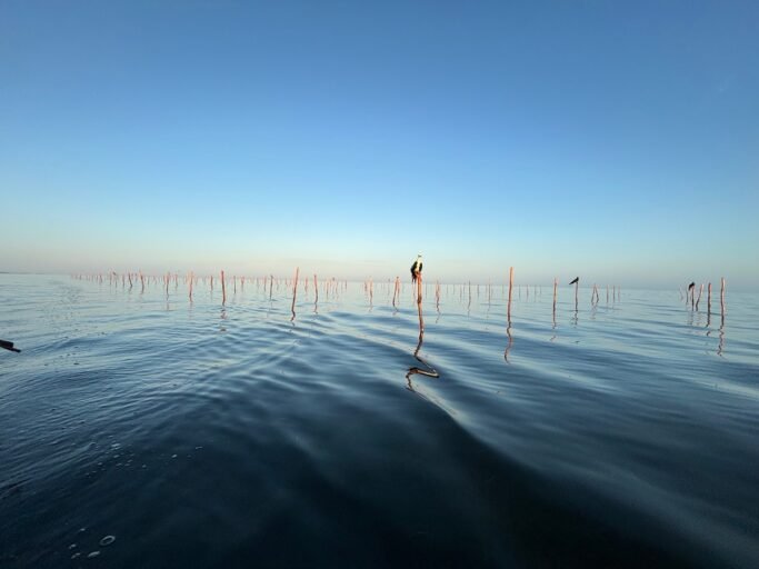 La zona de cultivo se distingue fácilmente porque los palos de zapote sobresalen del mar. Además de los fines de siembra, son un beneficio adicional para las aves que se posan en ellos, pues su excreta funciona como nutriente para las algas y, a la vez, esta fauna alerta a las embarcaciones que circulan en la zona de la existencia de las algas.