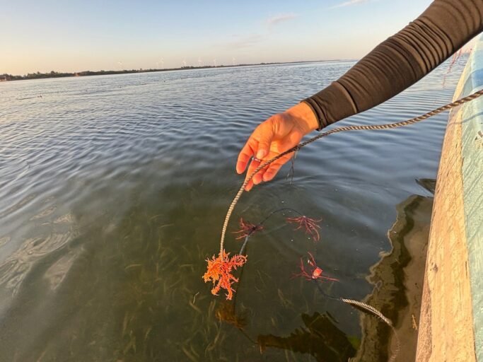 “La pesca ya ha escaseado mucho y con el cultivo de algas nos hemos dado cuenta de que es un trabajo tipo ‘de gota a gota’, trabajas todos los días de a poquito y tienes una ganancia segura. Ahora que viene la temporada de nortes pues uno no puede salir a pescar y en este caso, como está muy cerca de la playa podemos venir y trabajar un poco”, señaló David.