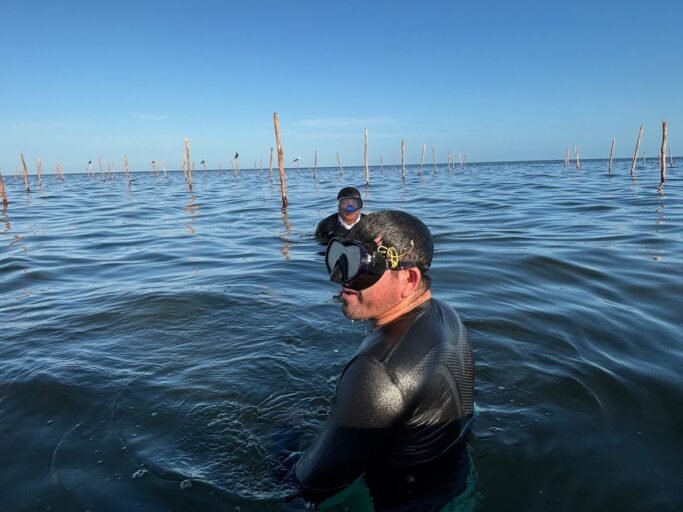 Juan Carlos Lapuente Landero, director de operaciones del equipo de ROP, explicó que el proyecto se desarrolla en dos hectáreas, donde se han sembrado 300 palos de zapote que sostienen las cuerdas en las que se colocan las algas bajo el agua.
