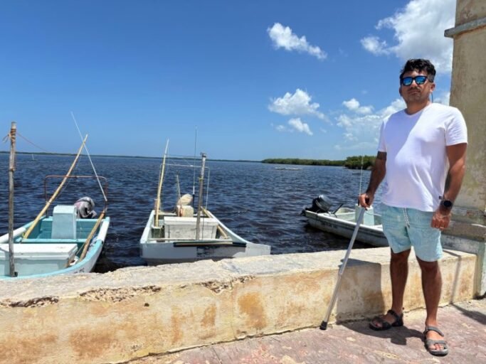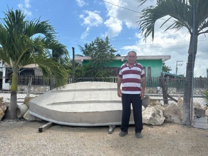 En su patio conserva una lancha volteada, símbolo de la vida que dejó atrás y desde ahí describe que para su recuperación, compañeros pescadores lo trasladaban diariamente a Tizimín para tener su sesión en la cámara hiperbárica.