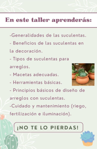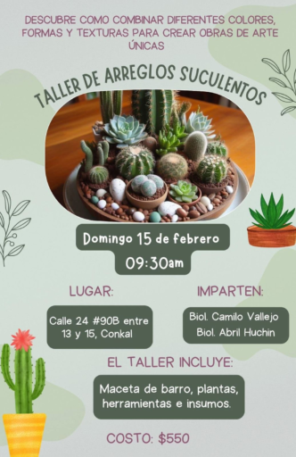 Si quieres tener una suculenta como decoración en tu hogar, o simplemente quieres aprender más sobre estas plantas. Este domingo, la bióloga Abril Huchin y el biólogo Camilo Vallejo, brindarán un taller que te va a encantar, con todas las herramientas que necesitas para hacer tus propios arreglos suculentos y cuidarlos.